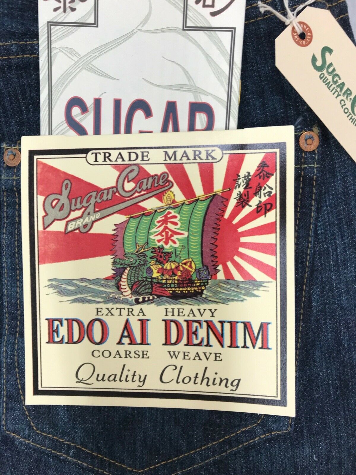 - Sewn tag on back of rising sun and traditional Japanese sailing ship.